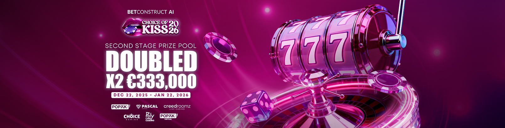 From 22 December 2025 to 22 January 2026, players can compete for a massive €666,000 prize pool. This stage is proudly supported by CreedRoomz, PopOK Gaming, Pascal Gaming, Choice Gaming, PopOk Virtual, and Poly Live Casino.